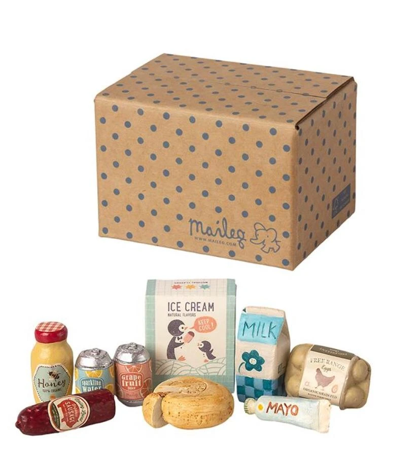Fun grocery box poly-resin food play set from Maileg. This adorable set includes a variety of 9 play food items; Honey, sparkling water, grapefruit juice, ice cream, milk, eggs, mayo, salami sausage, parmesan cheese all perfectly sized to work with the stylish retro metal fridge. A lovely addition to the Maileg furniture and accessories for bunnies, rabbits and mice. Dimensions: Grocery Box – Height 5.5cm, Width 8.5cm