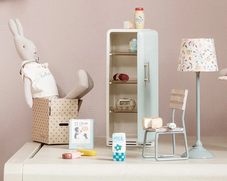 Fun grocery box poly-resin food play set from Maileg. This adorable set includes a variety of 9 play food items; Honey, sparkling water, grapefruit juice, ice cream, milk, eggs, mayo, salami sausage, parmesan cheese all perfectly sized to work with the stylish retro metal fridge. A lovely addition to the Maileg furniture and accessories for bunnies, rabbits and mice.