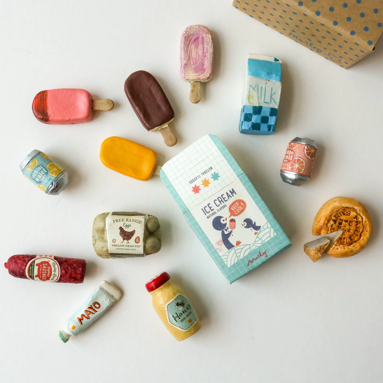 All the food your Maileg friend could possibly need. This selection of food includes mayo, milk, honey jar, sausage, 4 ice cream sticks, egg carton, 2 soda cans and a cheese. It will be delivered in a cardboard box. Maileg is a brand of charming Danish-designed toys created to inspire our children’s favorite playtime stories. By bringing storybook whimsy to everyday moments, Maileg toys help children explore the pure and simple wonder of imagination. Beloved for their heartwarming personalities, Maileg toys show playfulness and charm in every last detail. Theirs is a timeless world filled with beautiful accessories and settings to be collected, cherished and shared with friends and family for generations. Size: – Height: 5 cm Width: 6 cm Age: 3 YR + Wash: Surface wash Material: Polyresin