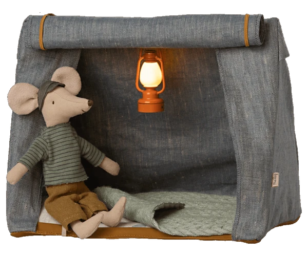 Size : Mouse Height : 17,5 cm Age: 3 years & up Washing instruction: Hand Wash Material: Cotton / Linen Take your mice along for a sleepover in the easy fold up tent. The blanket will keep you warm under the stars. Comes in a beautiful gift box. Mouse and lantern not included.