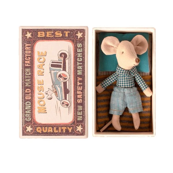 This little brother mouse by Maileg comes complete with his own sturdy cardboard matchbox home, a soft mattress, striped patterned hemmed blanket and a soft plump blue pillow. He is delightfully dressed with a gingham blue shirt and blue cotton trousers. With soft pink ears and an embroidered smile this happy little mouse in a matchbox is a gift that will be cherished forever. Mouse size 10 cm in height, suitable from 3 years and up, washable at 30 degrees.