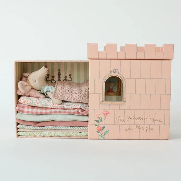 Once upon a time… Playset inspired by the famous fairy tale Princess and the pea. This set includes a castle with mattresses, a pea and a princess mouse. Maileg is a brand of charming Danish-designed toys created to inspire our children’s favorite playtime stories. By bringing storybook whimsy to everyday moments, Maileg toys help children explore the pure and simple wonder of imagination. Beloved for their heartwarming personalities, Maileg toys show playfulness and charm in every last detail. Theirs is a timeless world filled with beautiful accessories and settings to be collected, cherished and shared with friends and family for generations. 17cm high, 15cm wide Ages 3+ Materials: Cotton Filling: Recycled Polyester / Pe Pellets Wash at 30°C