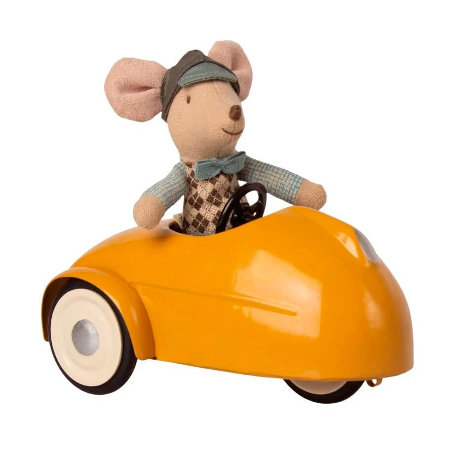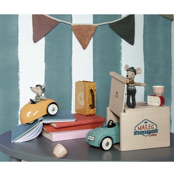 This mouse has no shortage of accessories to be charming. He wears a designer suit and drives a yellow metal car. Your car is kept in a wooden garage that can be opened and closed. Leave the car parked inside if you wish. It can be a lovely toy or a collectible.