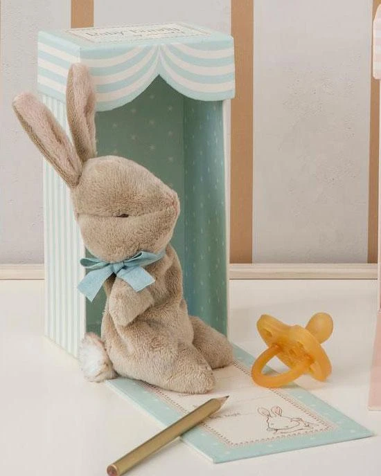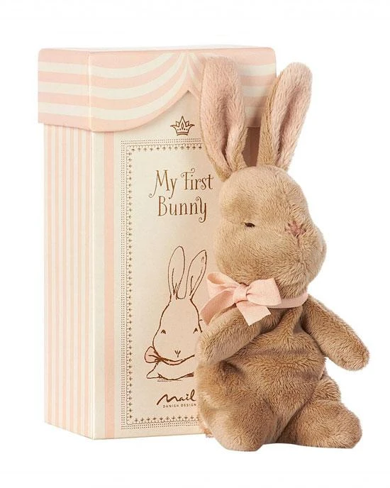 My First Bunny in Box, choose either Blue or Pink. With area inside box to write the babys name, date of birth, birth weight and height. Height : 19 cm Age: All ages Washing instruction: 30 degrees Material: Polyester About Maileg In a busy world of bright lights, bells and whistles, where new stories are continually impressed upon us… Maileg is a world in which matchboxes can be beds for mice; princesses make perfect teatime companions; and adventures can be found on a friendly forest walk. It is a world where cats and mice are friends. Ours is a world of childhood imagination – and this is a world we value. Maileg (pronounced My’lye) is a brand of charming Danish-designed toys created to inspire our children’s favorite playtime stories. By bringing storybook whimsy to everyday moments, Maileg toys help children explore the pure and simple wonder of imagination. Beloved for their heartwarming personalities, Maileg toys show playfulness and charm in every last detail. Theirs is a timeless world filled with beautiful accessories and settings to be collected, cherished and shared with friends and family for generations.