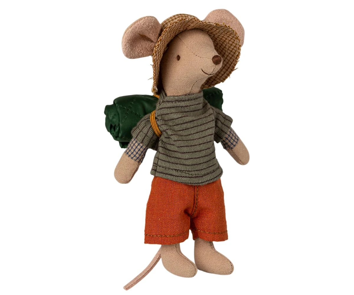 Big brother size camper mouse (12 cm), his clothes, his hat and his sleeping bag.