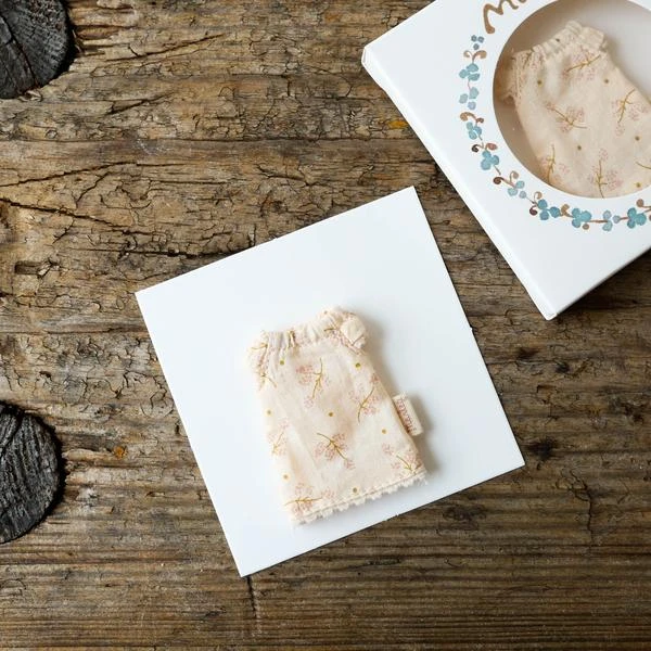 Dress your little sister mouse for a good night sleep or a cosy pyjamas party with this night gown. Maileg is a brand of charming Danish-designed toys created to inspire our children’s favorite playtime stories. By bringing storybook whimsy to everyday moments, Maileg toys help children explore the pure and simple wonder of imagination. Beloved for their heartwarming personalities, Maileg toys show playfulness and charm in every last detail. Theirs is a timeless world filled with beautiful accessories and settings to be collected, cherished and shared with friends and family for generations. 6 cm heigh Size: Little sister/brother Age: All ages Recommended age 3+ Materials: Cotton Wash at 30°C