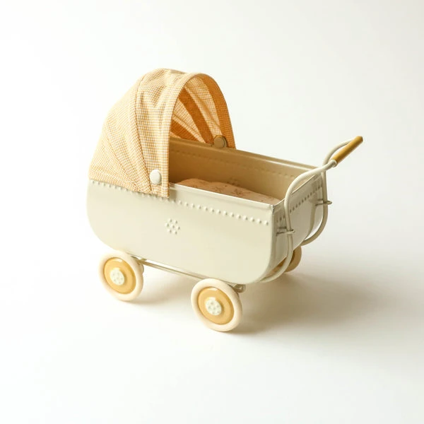 A beautiful Maileg pram with an exclusive vintage look. The metal part has embossed details on the sides, and the fabric cover fulfills the look. The pram is perfect for a walk in the park when the baby sleeps. Maileg is a brand of charming Danish-designed toys created to inspire our children’s favorite playtime stories. By bringing storybook whimsy to everyday moments, Maileg toys help children explore the pure and simple wonder of imagination. Beloved for their heartwarming personalities, Maileg toys show playfulness and charm in every last detail. Theirs is a timeless world filled with beautiful accessories and settings to be collected, cherished and shared with friends and family for generations. Size: Micro Height: 15 cm Width: 10 cm Age: 3 YR + Wash: Surface wash Material: METAL/PLASTIC/COTTON Filling: Recycled polyester