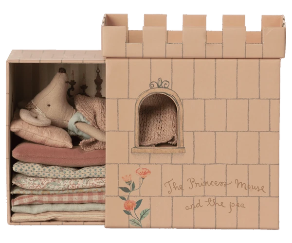 Once upon a time…. Maileg’s playest inspired by the fairytale. The set includes a beautiful paper keepsake castle box that slides open and closed as well as with mattresses, a pea, and a beautiful princess mouse in a sparkly dress. Maileg is a Danish toy brand founded in 1999 by illustrator Dorthe Mailil. They are known for their delightful and imaginative toy designs ranging from mice in matchboxes to giant bunnies, along with all the accessories and clothing o dress up her creations. Her unique touch and expression offer a distinctive look which children have grown to adore. Suitable for all ages, Maileg mice are made from natural materials and to a very high standard, so make great keepsakes and are perfect to hand down to siblings This set is suitable for ages 3 years+ Material: Cotton Size: Height 17cm Care Instructions: Hand washable at 30 degrees