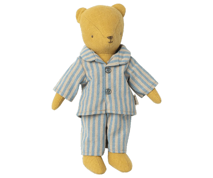 Dress your teddy junior for a good night’s sleep or a cosy pyjamas party with these pyjamas. Product details Size : Teddy junior Height: 16cm Age: 3 YR + Washing instruction: 30°C Material: Cotton Maileg (pronounced My’lye) is a brand of charming Danish-designed toys created to inspire our children’s favourite playtime stories. By bringing storybook whimsy to everyday moments, Maileg toys help children explore the pure and simple wonder of imagination. Beloved for their heartwarming personalities, Maileg toys show playfulness and charm in every last detail. Theirs is a timeless world filled with beautiful accessories and settings to be collected, cherished and shared with friends and family for generations.
