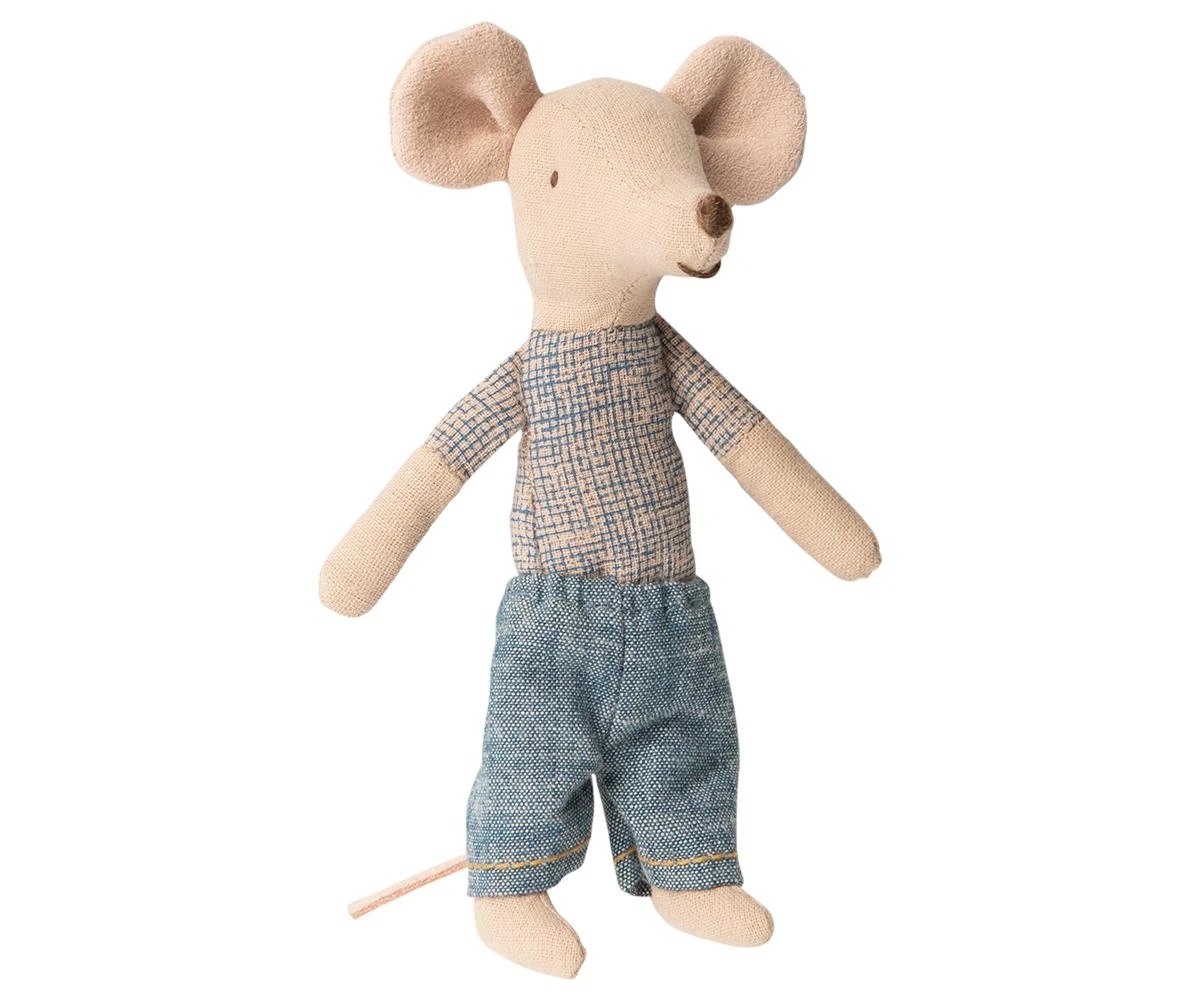 El ratón, hermano mayor de la línea Maileg descansa en su caja de cerillas de cartón resistente ilustrado para parecerse a una caja de cerillas. En el interior encontrarás: 1 hermano mayor tamaño ratón Maileg (13 cm), 1 colchón, 1 funda y 1 cojín de tela. Lleva un traje de rayas azules no removible y un par de pantalones azules removibles. Lavable a máquina, lavado delicado a 30 °.