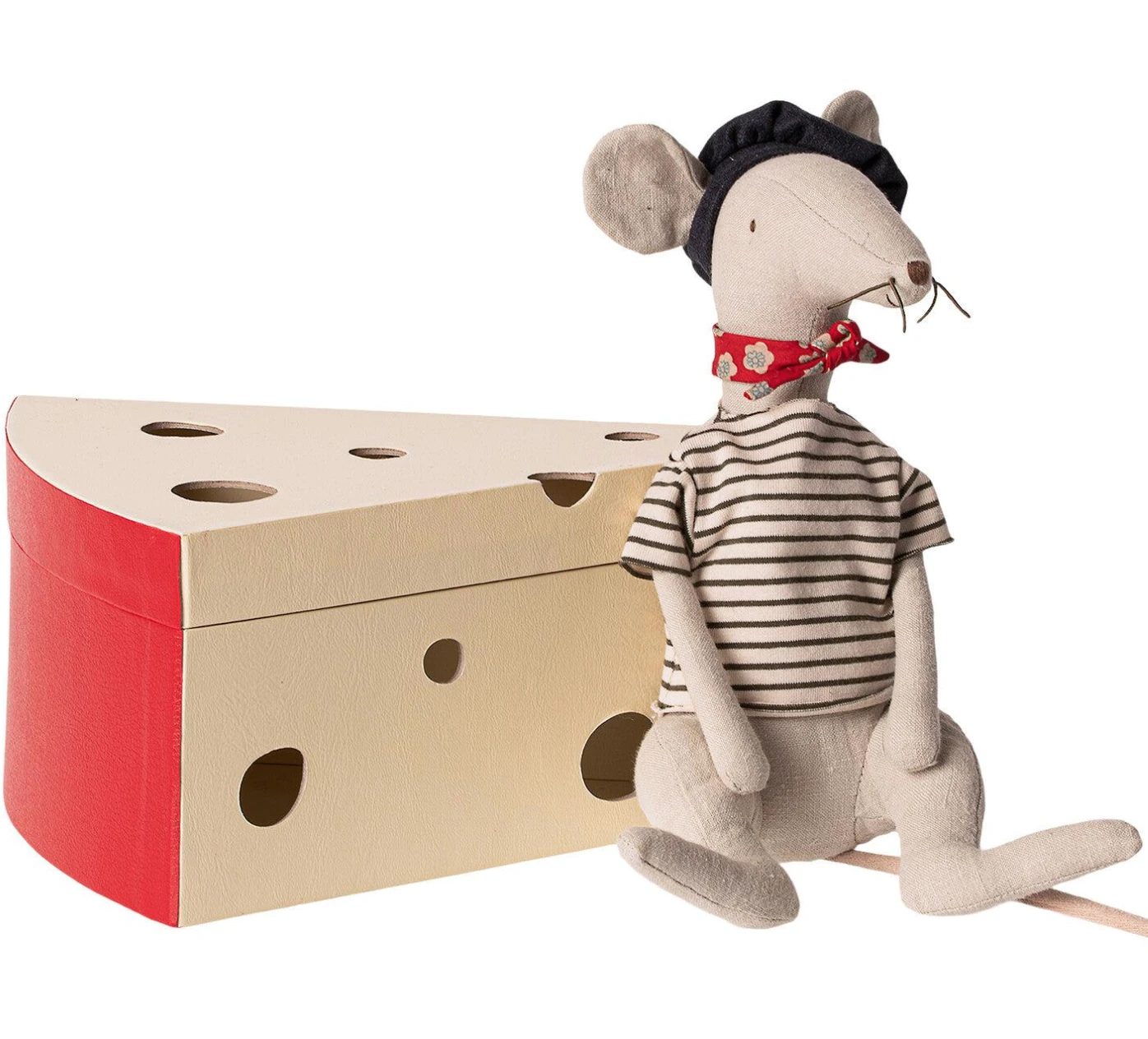 Maileg Light Grey Rat In Cheese Box. This very smart rat is made from a light grey linen and is wearing a beautifully designed French inspired outfit. He is dressed in a stripy blue and white T shirt, red floral neckerchief and dark blue beret. He comes with his own Edam cheese strong card box house.