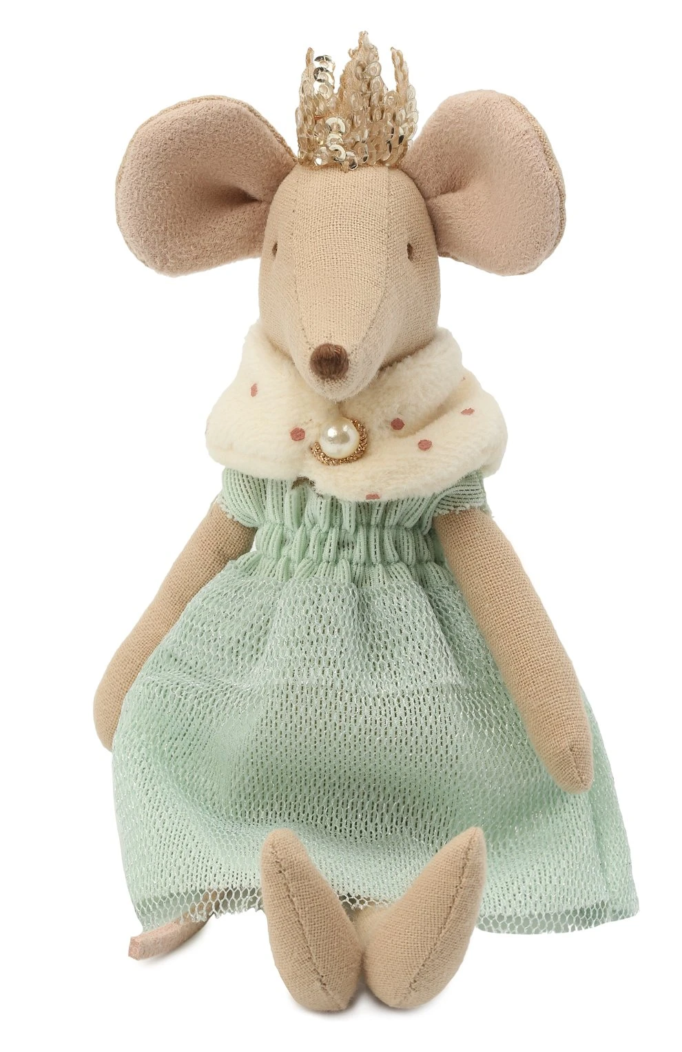 La reina mamá está lista para ir al baile con su vestido y su corona dorada tejida: su vestido es de tul verde claro con un cuello de piel típico de los reales atado con una preciosa perla y en la cabeza, entre las orejas, lleva una corona tejida con hilo dorado.