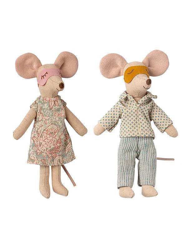 Un artículo clásico de Maileg. Los ratones de mamá y papá están usando sus hermosos pijamas y antifaces. La caja de puros es una cama perfecta para una buena noche de sueño y dulces sueños. La mamá lleva un cómodo camisón de flores y antifaz rosa y el papá ratón lleva un pijama azul con preciosos estampados y antifaz mostaza.