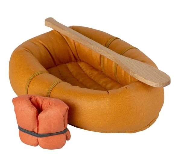 This little rubber boat is made of fabric and comes with life vest and paddle as well. It is not water proof, so you have to imagine it floats on the water. Height : 1,57 in Washing instruction: 30 degrees Material: COTTON