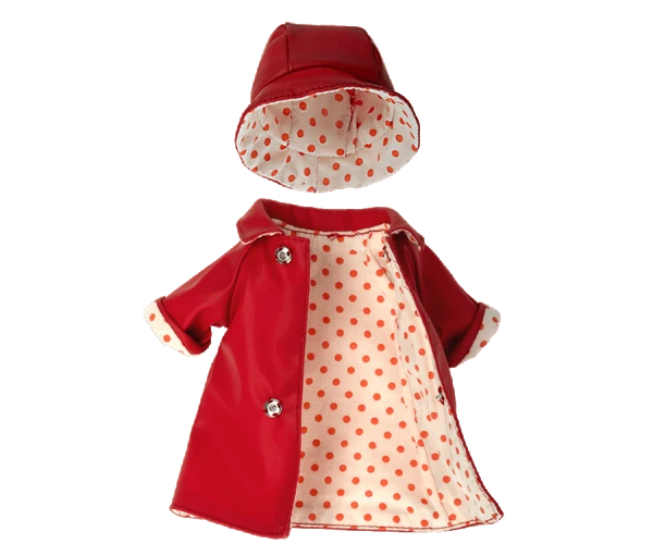 Fits Teddy Mum Height:13 cm Width:10 cm Recommended age:+3 Year Wash:30°CMaterial:Polyester / Cotton A beautiful set of rainwear that fits teddy mum. It will for sure keep her dry on rainy days. This set consists of a coat and a hat. Teddy not included.