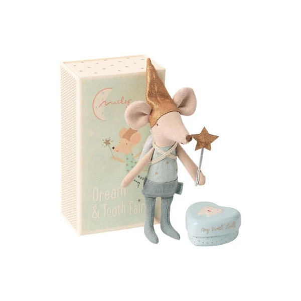 Maileg: Tooth Fairy – Big Brother Mouse With Metal Box. At night the tooth fairy spreads fairy dust, collects baby teeth, brings treats and always makes sure you have sweet dreams. Dressed magically in a blue starred top, stripped leggings, a shiny hat, and a sparkly backpack to store your tooth. Includes matchbox and a metal tooth box.Height : 12 cmAge: All agesWashing instruction: Hand WashMaterial: COTTON-POLYESTERSee the rest of the collection here.