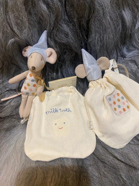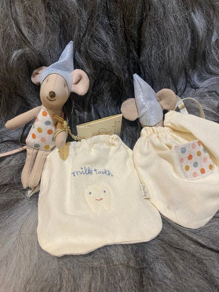 At night the tooth fairy spreads fairy dust, collects teeth, brings treats and makes sure you have sweet dreams. The mouse comes with a little bag. Item No.: 16-0720-00 Size: Little sister/brother Height: 10 cm Age: +3 Year Wash: 30°C Material: Cotton/Linen