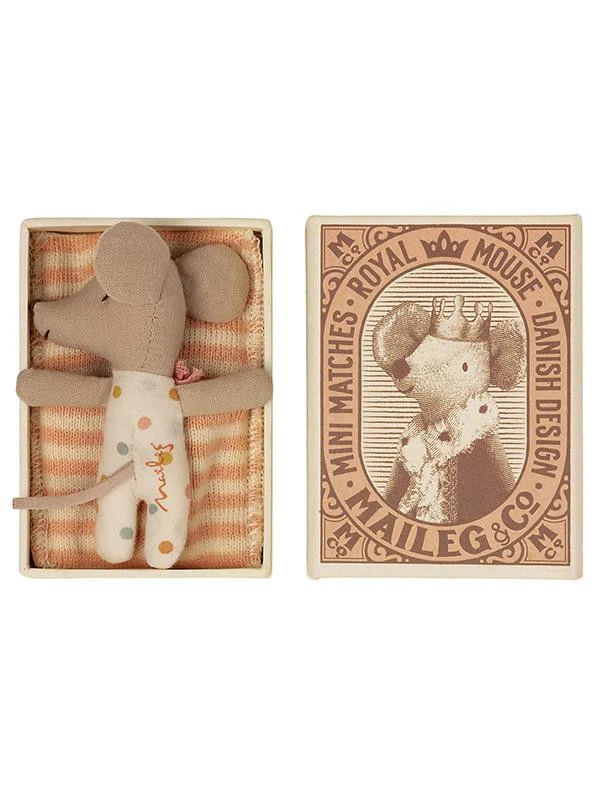 Un piccolo topino con il ciuccio da accudire e far dormire nel suo lettino che è una scatola di cartone che ricorda quelle dei fiammiferi.