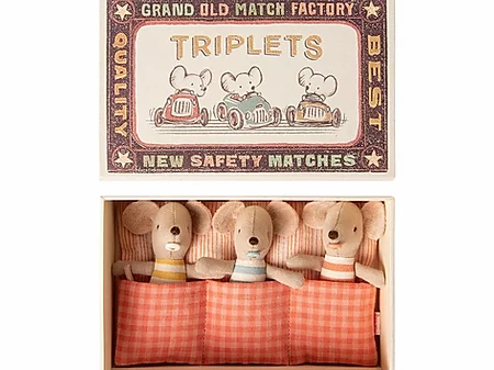 Now you can have 3 baby mice at the same time. The triplet baby mice are carefully tugged in their matchbox bed in the warm sleeping bag. They all have their own passifier and sleeps tight side by side. Size: 8cm.