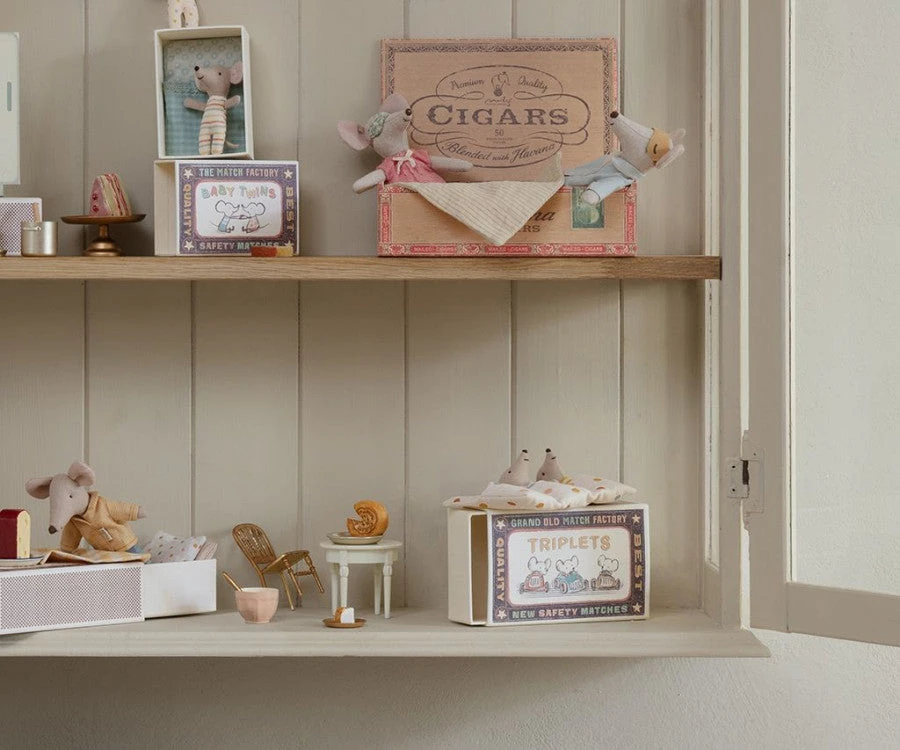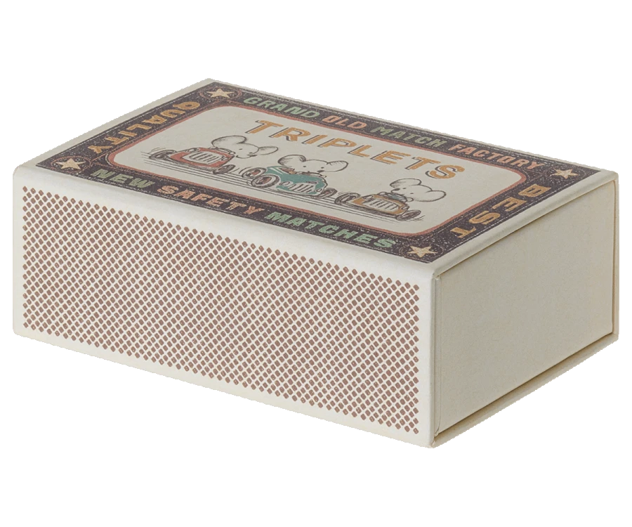Now you can have three baby mice at the same time. Tuck the triplet baby mice carefully in their matchbox bed in a warm sleeping bag where they sleep tight side by side. Product details Size: Baby mouse Height: 9 cm Age: All ages Washing instruction: 30°C Material: Cotton Filling: Recycled Polyester The Maileg Matchbox Mice collection is here Maileg (pronounced My’lye) is a brand of charming Danish-designed toys created to inspire our children’s favourite playtime stories. By bringing storybook whimsy to everyday moments, Maileg toys help children explore the pure and simple wonder of imagination. Beloved for their heartwarming personalities, Maileg toys show playfulness and charm in every last detail. Theirs is a timeless world filled with beautiful accessories and settings to be collected, cherished and shared with friends and family for generations.