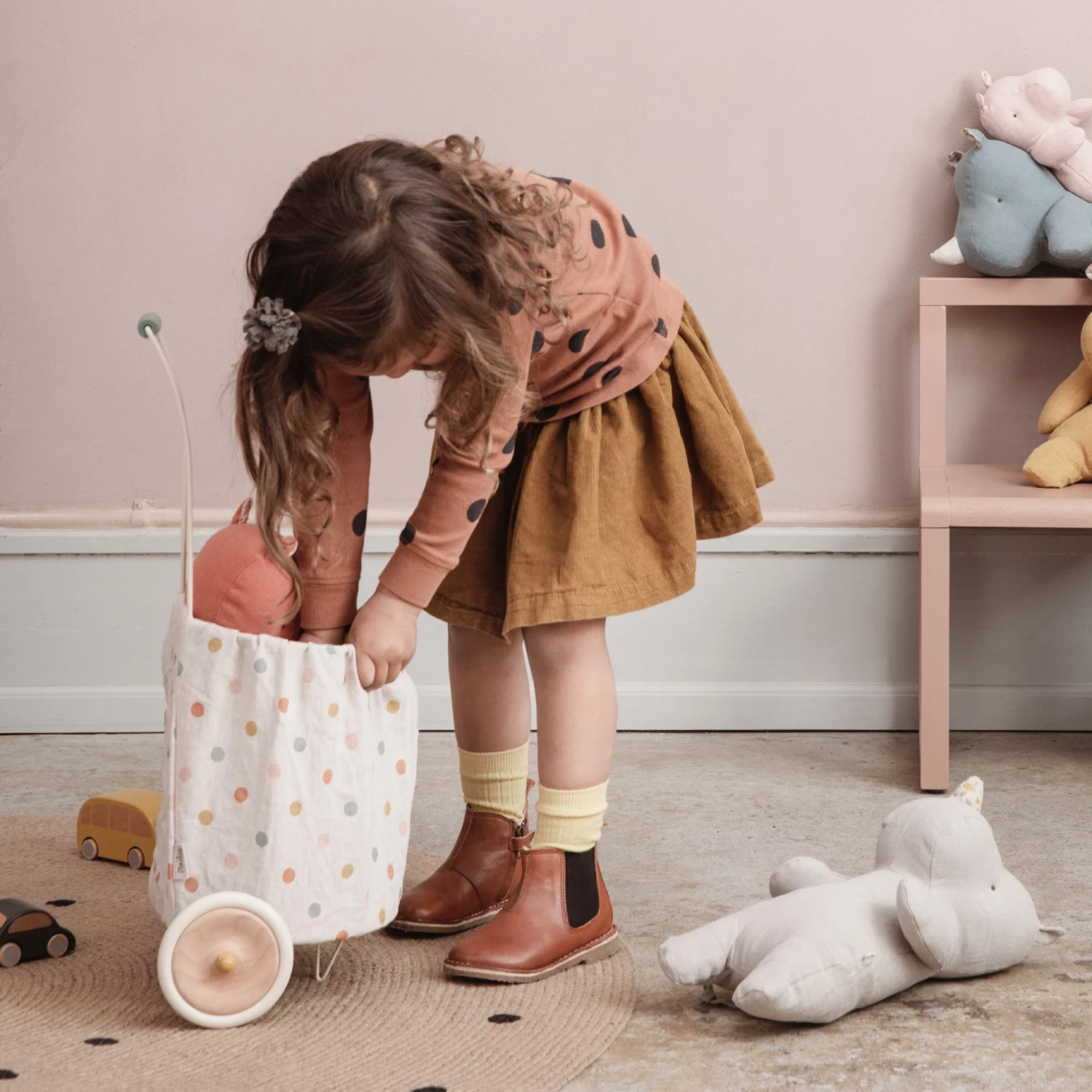 A trolley is absolutely essential for carrying all your soft friends and toys around. This adorable Maileg trolley is covered with dotty linen fabric that has a soft coating which will help to keep the fabric clean. The fabric designed exclusively by Maileg and is easy to take off and wash. How perfect it would look under the Christmas tree overflowing with presents wrapped in Maileg’s gorgeous Christmas wrap!