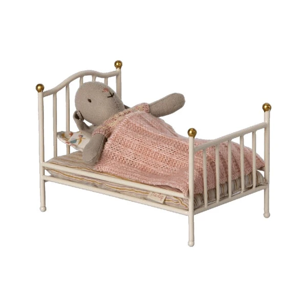 Maileg: Vintage Bed – Mouse Off-White. Let your Maileg friends have a sleep-over in the vintage metal bed. It comes with a mattress and pillow made in our beautiful Maileg printed fabrics. On top, a knitted blanket will keep the small friends warm. It fits the smaller mice perfectly.Height : 8 cmWidth : 12 cmAge: 3 yrsWashing instruction: Surface washMaterial: Metal/CottonSee the rest of the collection here.