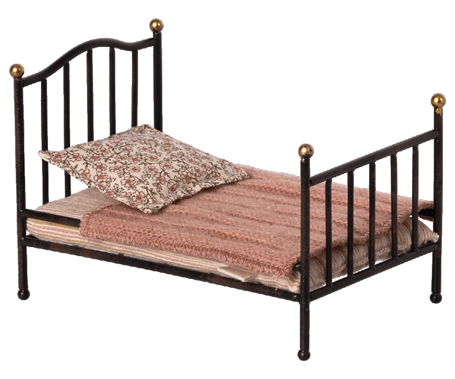 Das kleine Metallbett im Vintagestil ist ideal für kleine Hasen- und Mäusebabys geeignet. Das nostalgische Eisengestell ist dunkelbraun fast schwarz gestrichen und wird von goldfarbenen Kugeln gekrönt. Das Bett ist mit einer Matratze und einem Kissen mit den schönen Nostalgiestoffen von Maileg ausgestattet. Eine kleine gestrickte Decke hält die kleinen Freunde warm. Abmessung: L 12 H 8 cm Material: Metall Baumwolle Matratzenfüllung: Polyester Farbe: Anthrazit Old Rose Pflege: Gestell feucht abwischen die Textilien können bei Bedarf im Schonwaschgang gewaschen werden Handwäsche empfohlen.